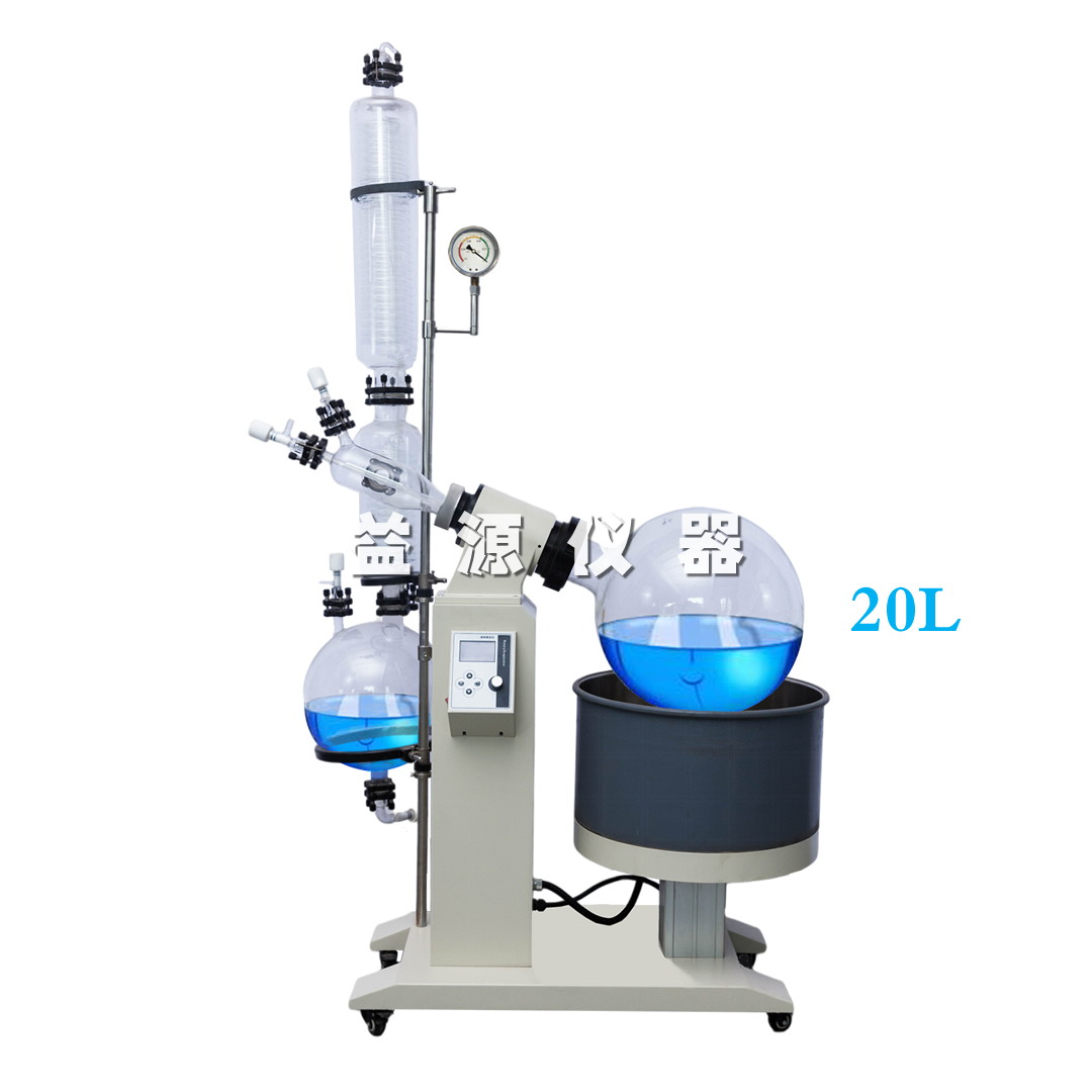 旋转蒸发器是用无级调速使玻璃旋转瓶恒速旋转,物料在瓶壁形成大面积均匀薄膜,再由智能恒温水浴锅对旋转瓶进行均匀加热,在真空条件下高速蒸发,溶媒蒸气经高效玻璃冷凝器冷却,回收于收集瓶。