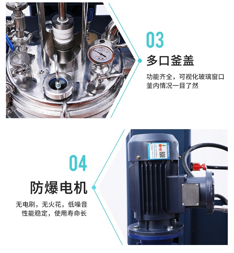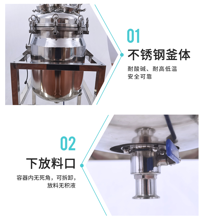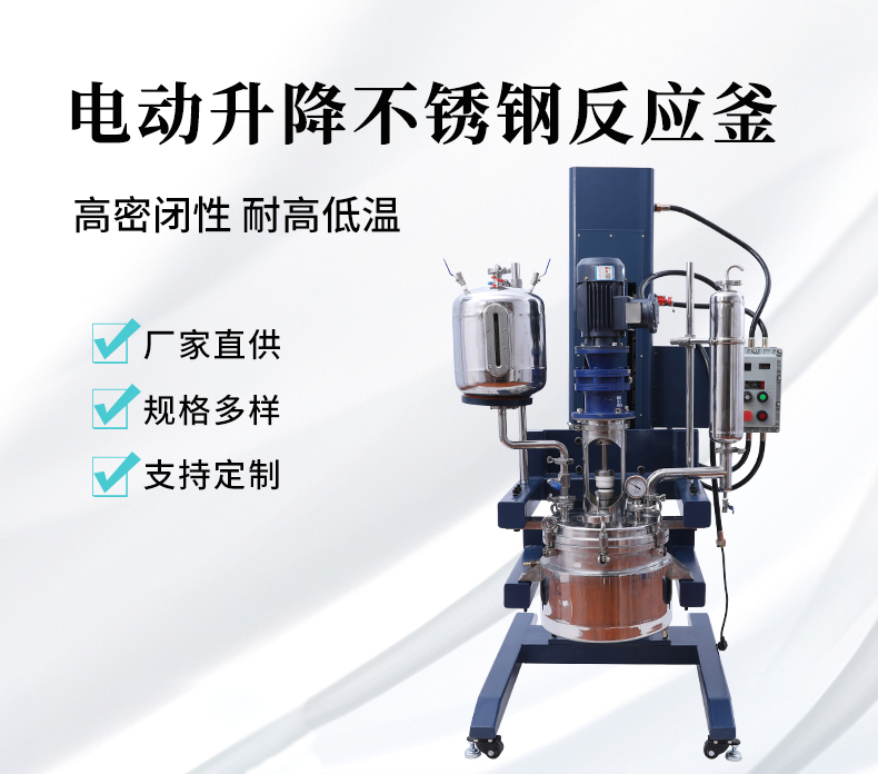 电动升降不锈钢反应釜釜盖及搅拌系统整体升起,釜体可旋转360度,可以直接倒出比较粘稠的物料,方便清洗釜体;液体物料也可从釜底的出料口放出,操作极为方便。